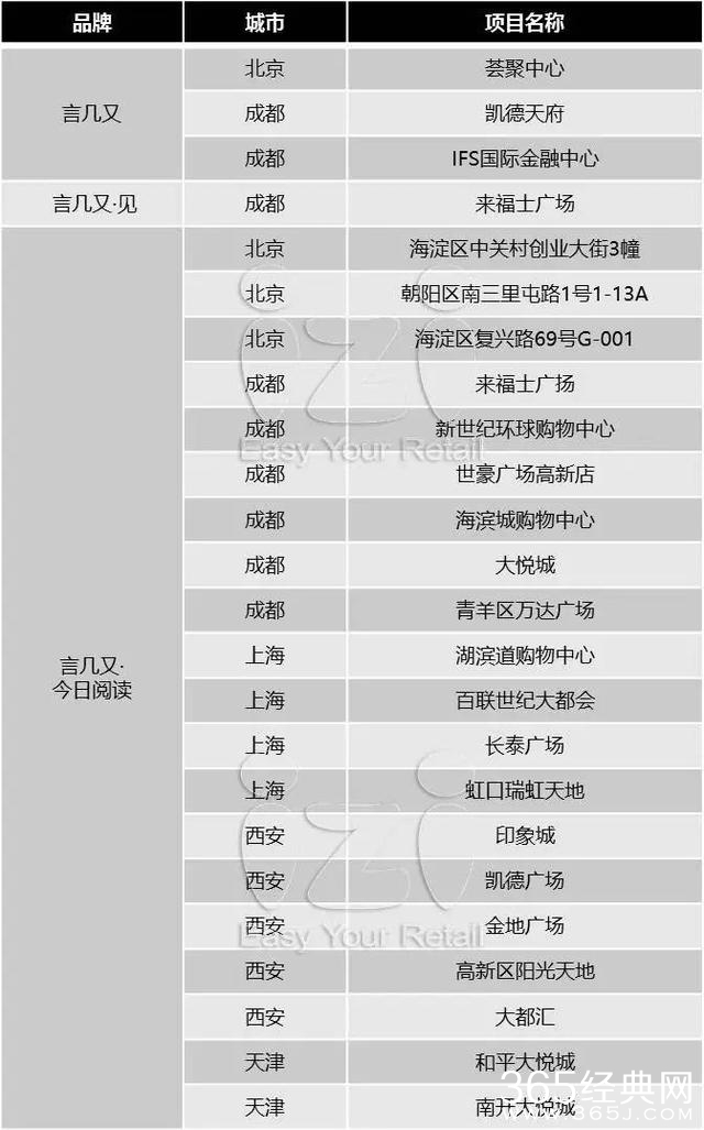 目前旗下品牌有:言几又、言几又·今日阅读、言几又·见,此外,还有和银行合作的书店银行项目。