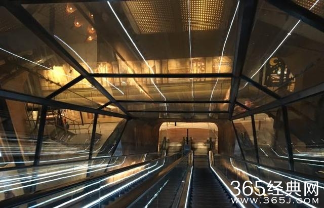 成都远洋太古里店,有以方舟、时空隧道设计的双向手扶梯、藏经阁主题的书架格局、铺满行星轨迹的水磨石地面等等。