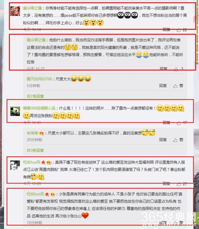 “ 你秀身材能不能有选择性一点啊,拍裸露照能不能找审美水平高一点的摄影师啊?露太多,没有美感的...... 摆pose能不能麻烦你自己多想想啊,我也不想当粉丝当的跟个黑粉似的啊...... 拜托你多上点心,好么”