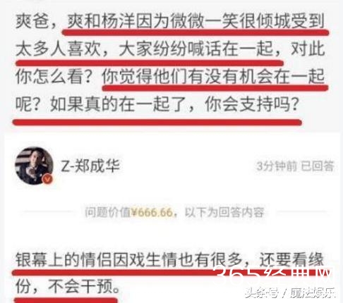 既然有网友问了胡彦斌,自然也会有网友问杨洋,毕竟郑爽和杨洋的关系一直微妙,网友们也是想从郑爸爸这里打探点消息。所以就有网友在网上提问:爽爸,爽和杨洋因为微微一笑很倾城受到太多人喜欢,大家纷纷喊话在一起,对此你怎么看?你觉得他们有没有机会在一起呢?如果真的在一起了,你会支持吗?