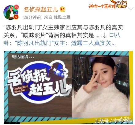 赵五儿也是没有闲着,他找到“陈羽凡出轨门”的女主,但是人家说是普通朋友而且所有人都可以作证,拍照的时候所有人都在场,回家的时候也是羽凡自己回家的,谣言不攻自破。