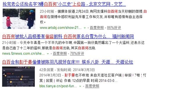 如“白百何上位史”、“白百何偷窃”、“白百何与彭于晏捉奸在床”......