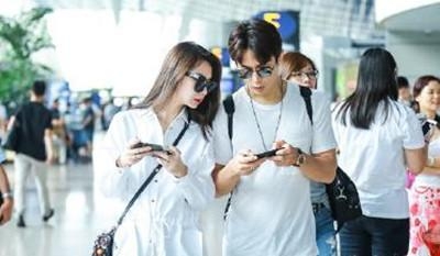 著名女星戚薇和李承铉,两人虽然都很年轻,但是他们都在玩手机,不看路也不牵手