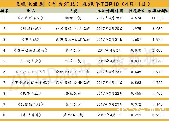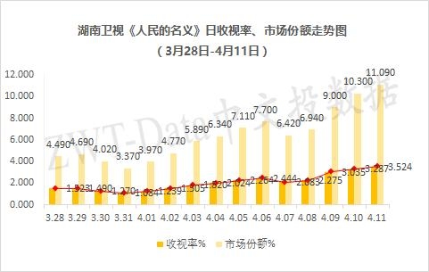 湖南卫视年度反腐大剧《人民的名义》在3月28日全网首播,自3月30日起,该剧的收视率持续走高,其他卫视的剧目已然无法阻止该剧的加速势头,截至4月11日,已经连续13天雄霸电视剧榜首,收视率高于第二名《剃刀边缘》(东方卫视、北京卫视,一剧双星)50%以上,不要忘记本排行榜是渠道汇总(一剧双星复合计算收视率)。而自4月10日起,该剧的收视份额已经破10,相当于每100个同一时间段开机的电视,有10台在追剧。