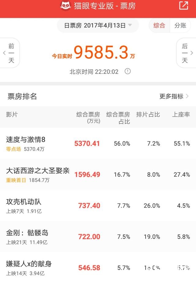 经过周二周三连续两天持续低迷,中国内地电影市场今天(4月13日)在《速度与激情8》零点场和《大话西游之大圣娶亲》纪念加长版提前4小时上映的带动下,票房从昨天的3421万元,暴涨6000多万元,截至22:20,大盘报收9585万元。其中,《速度与激情8》零点场票房高达5370万元,夺日票房冠军。《大话西游之大圣娶亲》在内地第三次上映,首日票房居然有1596万元,名列第二。