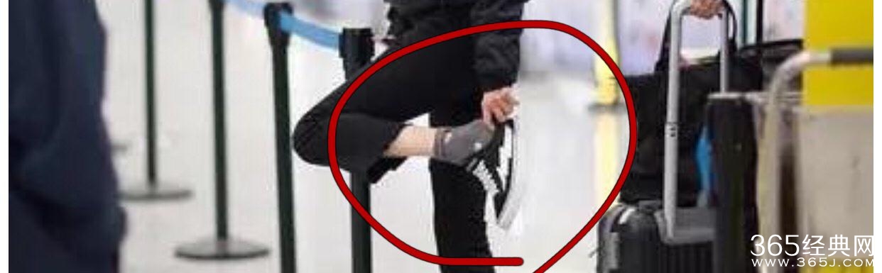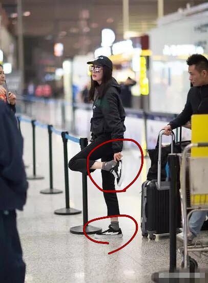可能是因为人太多了吧,杨幂的鞋子好像半路被踩掉了,在机场大厅,杨幂单腿站立着一手提鞋子。