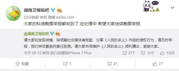 但是小编今天突然看到,湖南卫视的微博官方账号发布了:对《人民的名义》侵权行为的申明,对贩卖、分享的都要进行举报查处。