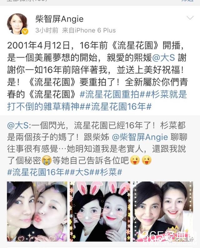 4月11日晚上八点,大S在微博晒出与柴智屏的合照,并感慨距离《流星花园》播出已经16年了,杉菜都已经是两个孩子的妈了。柴智屏马上转发,说道:“感谢熙媛一如16年前陪伴着我,并送上祝福!是!《流星花园》要重拍了。“还公布了概念海报。