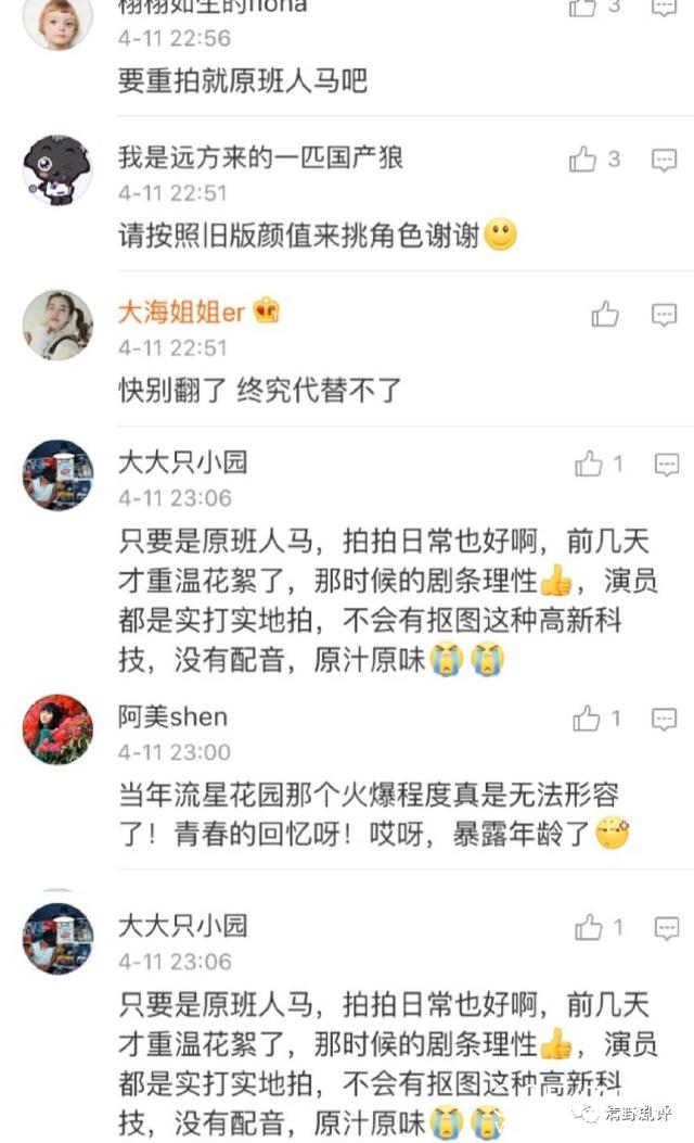 不过,在一大片的回忆声里,网友们最关注的就是重拍选角问题,很多网友都说:“建议不要翻拍,因为现在的翻拍都是毁经典,你看2016年的《恶作剧之吻》被拍的多糙心,还有《笑傲江湖》都被翻怕了十几次了,最近有消息都还要翻拍,再这样观众都要麻木了好嘛?如果实在要重拍的话,建议是原班人马,这样才能最高程度还原我们记忆中的经典。”