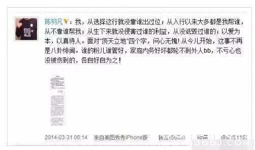 许多人都说这么的言论是不公平的,有人呵斥说“陈羽凡长的丑。老婆越轨正常的。”不明白他们的三观怎样是这个姿态的,乃至有的网友生气的说你们的意思是自个的老公不帅的话,就可以光明正大的越轨了吗?