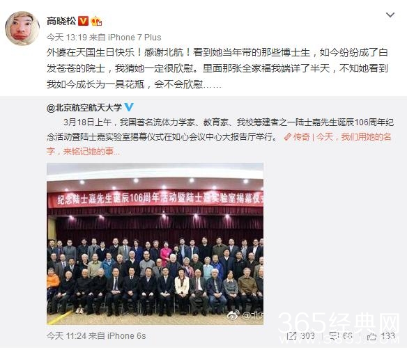 高晓松微博:外婆在天国生日快乐!感谢北航!看到她当年带的那些博士生,如今纷纷成了白发苍苍的院士,我猜她一定很欣慰。里面那张全家福我端详了半天,不知她看到我如今成长为一具花瓶,会不会欣慰……
