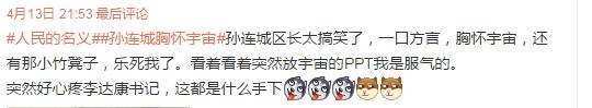 第一集丁义珍出逃美国后,李达康就是让他接替了光明区总指挥这个位置。但是孙连城呀,就是这么“烂泥扶不上墙”的人,遇到工作就是爱磨爱拖,不爱出力。“#孙连城胸怀宇宙#”的梗,居然还上了热搜榜。
