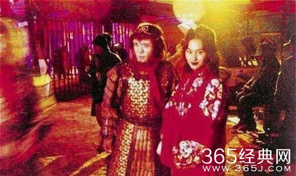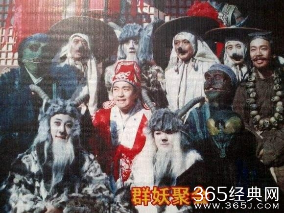 这场戏应该是紫霞被牛魔王绑去,至尊宝去救她,周星驰穿着大婚的服装和一种“妖怪”合影。