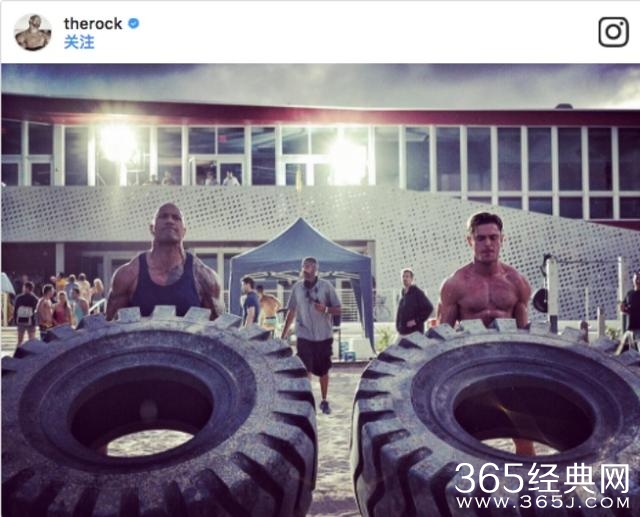 他还和《海滩救生队》的联合主演Zac Efron一起翻轮胎。
