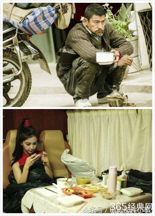 除了片中的吃饭戏,在剧组期间下了戏不同明星吃饭也有天壤之别,比起随便就蹲在片场抱着饭缸吃饭的天王,我们杨女士在舒适的空调保姆车上吃着搭配比例完美的餐点玩着手机真的是轻松惬意的很。