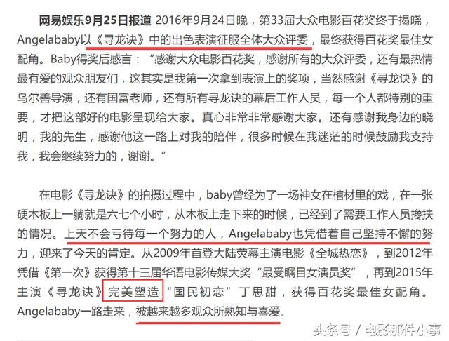 写过这么多八卦类的文章,小事向来都是有理有据用事实说话。被投诉侵犯名誉权独此一桩,文章因侵犯他人名誉权被删除也是头一回,这也给小事留下了极为深刻的印象。对此,小事进行了深刻的自我反省,应该进行些关于杨女士阳光积极些的话题。近些日子,新生代演员频频被老演员diss演技差不敬业等问题。但杨女士恐怕不在这一行列。老戏骨也并不是不满全部新生代演员,而是对部分新人演员演技不好还不敬业拍戏的态度有些不满,更多努力敬业的年轻演员是被连累的。杨女士敬业的新闻一向很多,老戏骨们看到恐怕也会欣慰后继有人。所以小事笃定这个话题,应该是个安全又令人愉悦的话题。为什么呢,先容小事吹一发,我们杨女士是第33届大众电影百花奖最佳女配角奖的获得者,肯定不是演技差那一行列