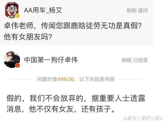 又有网友问卓伟鹿晗是不是有女朋友了?卓伟说有重要人士透露,鹿晗不仅有女友,还有孩子。哇,这又是一条劲曝的消息,卓伟肯定会被鹿晗的女粉丝们吐口水淹死的吧。