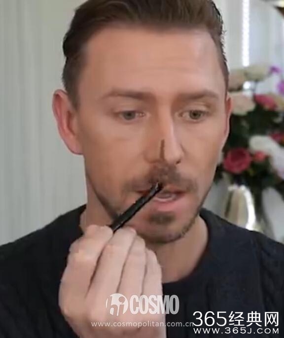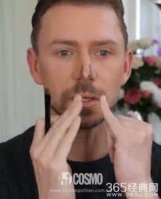 首先我们先用高光找到鼻子的中心点,然后别着急加阴影。用深色修容笔勾勒出鼻部轮廓,在鼻头处画上一个小节,可以让鼻头更高挺。