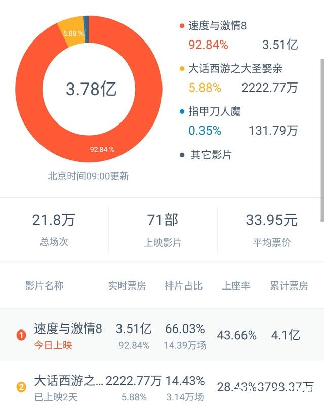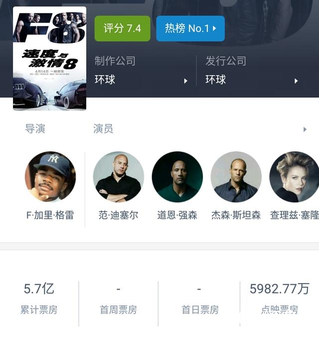 4月14日速度与激情上映首日就轻松拿下来4.1亿票房,轻松打破《西游伏妖篇》3.55亿的单日最高票房纪录,成为中国内地影史新的单日票房冠军。接着目前《速度8》票房已达到5.7亿。