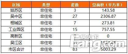 4月15日苏州非住宅成交83套, 比前一日交易减少18套,降幅17.82为%,成交面积5003.29㎡,比前一交易日减少862㎡,降幅14.7%,成交套均面积为60.28㎡。