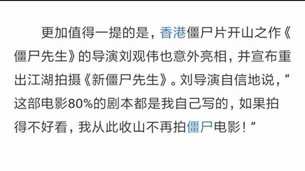 让人想到在香港国际影视展举办战略合作发布会上刘观伟曾宣布将开拍的《新僵尸先生》,他曾自信地表示,该片大部分为自己原创,如果不好看,自己从此以后收山不再开拍僵尸电影。