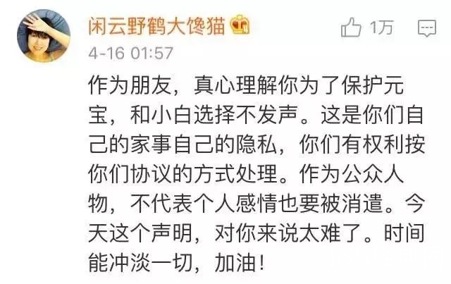 闲云野鹤大馋猫:作为朋友,真心理解你为了保护元宝,和小白选择不发声。这是你们自己的家事自己的隐私,你们有权利按你们协议的方式处理。作为公众人物,不代表个人感情也要被消遣。今天这个声明,对你来说太难了。时间能冲淡一切,加油!
