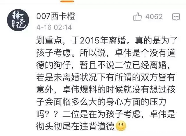 007西卡橙:划重点,于2015年离婚。真的是为了孩子考虑。所以说,卓伟是个没有道德的狗仔,暂且不说二位已经离婚,若是未离婚状况下有所谓的双方皆有意外,卓伟爆料的时候就没有想过孩子会面临多么大的身心方面的压力吗??二位是在为孩子考虑,卓伟是彻头彻尾在违背道德