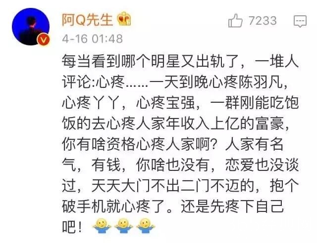 阿Q先生:每当看到哪个明星又出轨了,一堆人评论:心疼……一天到晚心疼陈羽凡,心疼丫丫,心疼宝强,一群刚能吃饱饭的去心疼人家年收入上亿的富豪,你有啥资格心疼人家啊?人家有名气,有钱,你啥也没有,恋爱也没谈过,天天大门不出二门不迈的,抱个破手机就心疼了。还是先疼下自己吧!