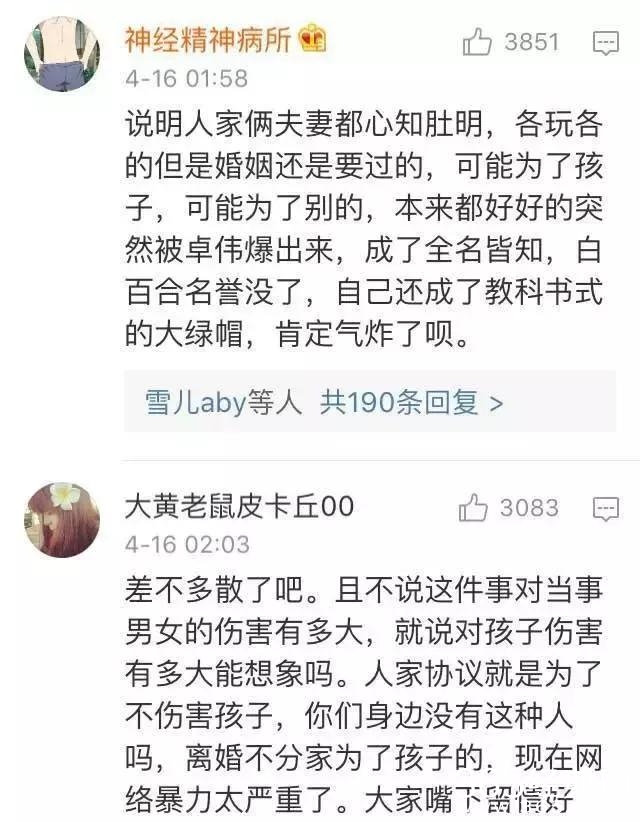 神经精神病所:说明人家俩夫妻都心知肚明,各玩各的但是婚姻还是要过的,可能为了孩子,可能为了别的,本来都好好的突然被卓伟爆出来,成了全名皆知,白百合名誉没了,自己还成了教科书式的大绿帽,肯定气炸了呗。