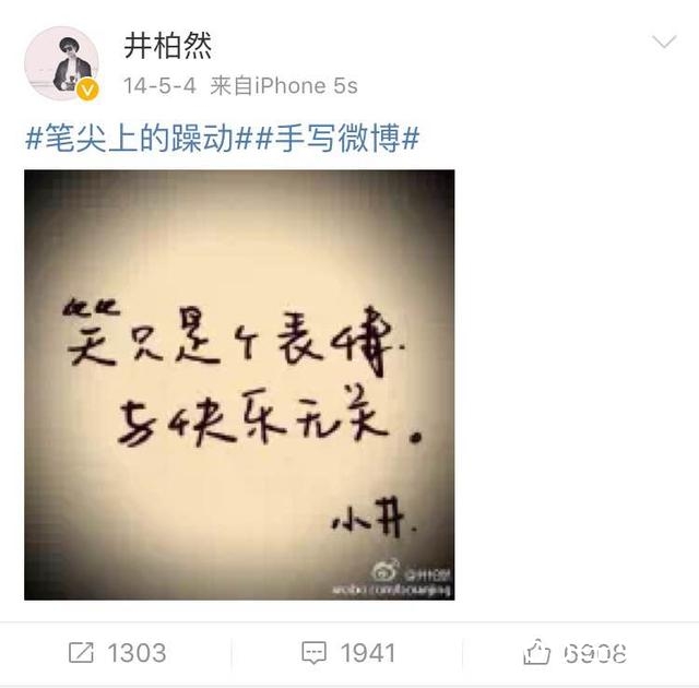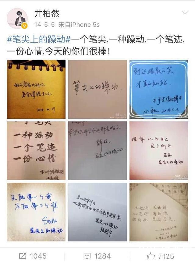 前两年井柏然还没有大火的时候经常在微博更一个话题,叫“笔尖的躁动”,就是提倡大家手写微博。井柏然的字也是在那时被迷妹们看上的~