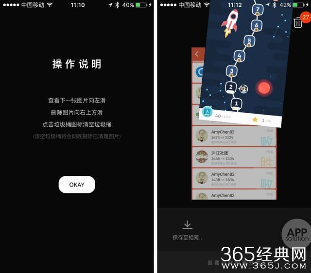 当然,对 16G 用户来说,最大的作用莫过于可以快速地删除照片:只要「刷刷刷」地把照片向屏幕右上方扔,然后一键清空垃圾桶, 就能彻底删除不想要的图片。