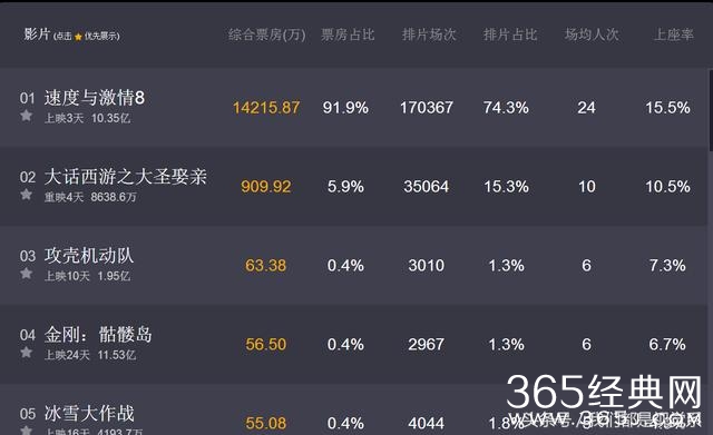 3天就差点打破了金刚。速8的排片占比也很高,达到了百分之74.3%,而星爷的排片占比就很少了,就15.3%。