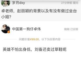 有微博网友提问“卓老师,赵丽颖的背景以及有没有做过坐台小姐?”卓伟回答“英雄不怕出身低,刘备还卖过草鞋呢”,言外之意卓伟肯定赵丽颖的背景以及做过坐台小姐的出身,可是众所周知赵丽颖虽不是出自名门,但是人家可是很努力的。