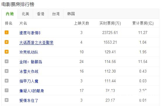 截止15日下午15点30,速8过11亿,今天周末,破13的问题应该不是很大!并且今天会破掉上映24天的金刚:骷髅岛的11.54亿的票房总和。