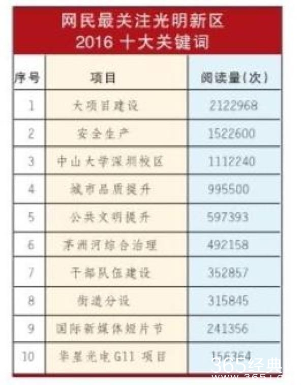 相关调查和统计表明,网民2016年最关注光明新区的“十大关键词”揭晓:大项目建设、安全生产、中山大学深圳校区、城市品质提升、公共文明提升、茅洲河综合治理、干部队伍建设、街道分设、国际新媒体短片节、华星光电G11项目。据统计,光明新区“大项目建设”相关话题阅读量逾212万,“安全生产”话题阅读量超过152万,“中山大学深圳校区”话题阅读量超过111万,其他关键词相关报道和话题的阅读量均逾10万。