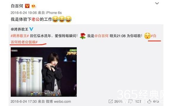 白百何参加《跨界歌王》,还说来体验老公的工作,老公一字一句用微信教她唱歌,微博还有个话题“白百何抢老公饭碗”。