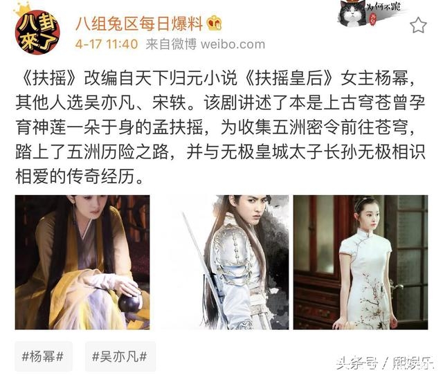 《扶摇》改编自天下归元小说《扶摇皇后》女主杨幂,男主暂定吴亦凡。该剧讲述了本是上古穹苍曾孕育神莲一朵于身的孟扶摇,为收集五洲密令前往苍穹,踏上了五洲历险之路,并与无极皇城太子长孙无极相识相爱的传奇经历。