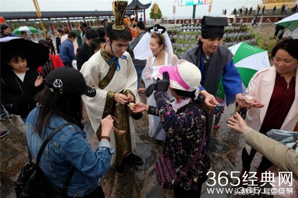 大咖范蠡在范蠡阁前向游客诵读著名的《经商十八法》