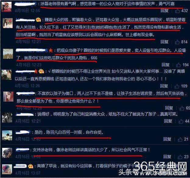 网友评论:涂磊老师很有勇气,感觉是唯一的公众人物对于这件事情的发声,勇气可嘉。把观众当傻子啊!圈钱的时候我们是恩爱夫妻,卖人设吸引吃瓜群众,人设塌了,就是你们这些吃瓜群众干扰别人的隐私。不喜欢以孩子为借口,两人过不下去不是错,让孩子生活在谎言里,然后有天你告诉他,那么做全是为了他,你是想让他背负什么?纸终究是包不住火的,陈羽凡白百合一对假夫妻,自作自受。