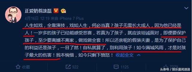 涂磊老师微博发言:人生如戏,全靠演技,戏如人生,何必当真?孩子无需长大成人,因为他已经是人!一岁多的孩子已经能感受悲喜,若真为了孩子,就应该坦诚面对,即使要保护孩子,至少要离婚不离家,做戏做全套!所以还亲昵的假装夫妻,是为了保护自己的利益还是孩子,一目了然!自私也就算了,别利用孩子!如今满城风雨,才是对孩子最大的伤害!我本惋惜,如今只剩下愤怒。