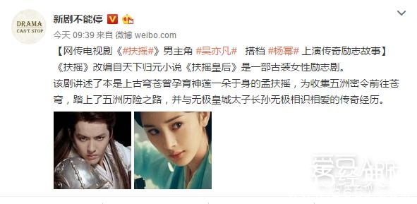 爱豆新闻讯 今日有网曝消息称,吴亦凡将搭档女演员杨幂共同出演古装IP电视剧《扶摇》(原名:《扶摇皇后》)。《扶摇》改编自天下归元小说《扶摇皇后》是一部古装女性励志剧,目前已确定女主孟扶摇由杨幂出演。该剧讲述了本是上古穹苍曾孕育神莲一朵于身的孟扶摇,为收集五洲密令前往苍穹,踏上了五洲历险之路,并与无极皇城太子长孙无极相识相爱的传奇经历,如果消息属实,吴亦凡将饰演男主长孙无极。