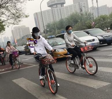 江疏影口罩帽子齐上阵,在街边骑自行车,但是身边的人群一波一波的过去。