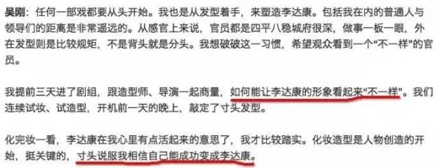 (“领导们的发型是比较规矩的,不是背头就是分头。我想破这一个习惯,希望观众看到一个‘不一样’的官员。”)