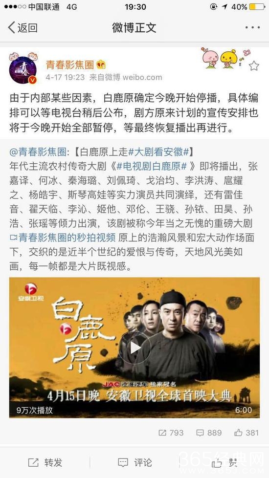 原定于4月16日,在安徽卫视、江苏卫视播出的85集大型电视连续剧《白鹿原》,刚刚才开播一天就被火速“叫停”了。与此同时被叫停的,还有剧方的宣传计划。