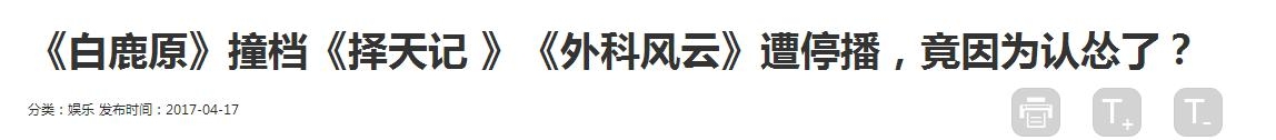 这也是目前最受网友们关注和认可的一个原因。放眼就在《白鹿原》开播的转天4月17日,就将有两档集结了众多人气明星和海量娱乐话题的新剧即将上映——鹿晗、古力娜扎主演的《择天记》和靳东、白百何主演的《外科风云》。