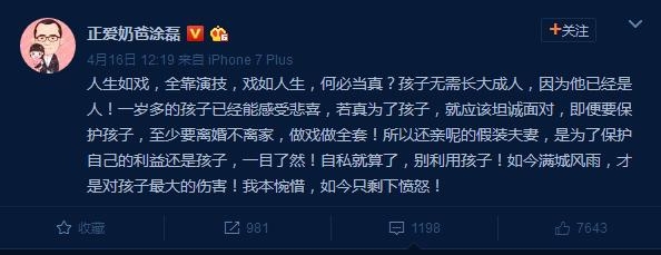 4月16日,涂磊发了一条微博,意指白百何。他说道:人生如戏,全靠演技,戏如人生,何必当真?孩子无需长大成人,因为他已经是人!一岁多的孩子已经能感受悲喜,若真为了孩子,就应该坦诚面对,即便要保护孩子,至少要离婚不离家,做戏做全套!所以还亲呢的假装夫妻,是为了保护自己的利益还是孩子,一目了然!自私就算了,别利用孩子!如今满城风雨,才是对孩子最大的伤害!我本惋惜,如今只剩下愤怒!火影忍者剧情介绍