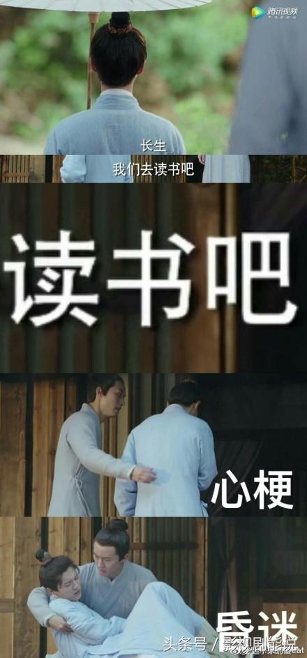 长大后的长生在自家院子前怀念小容儿,师兄喊他去读书,一言不合就晕倒。(这不就是平时不爱读书的我们吗)