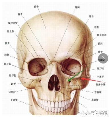 我们平时说到下颌骨会比较多。这里看下上颌骨的位置。和颧骨、鼻骨相接。就是图中颜色为绿色的骨块。