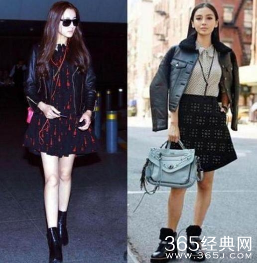 前面都是穿裙子,全身遮住了,但是下面这张就好明显了。同样是短裙 短靴,迪丽热巴身穿印花连衣短裙 皮外套,baby是黑白相间的衬衫印花短裙 短款皮衣。两人都好美,但是有个严重缺陷baby的双腿直接暴露了全部。