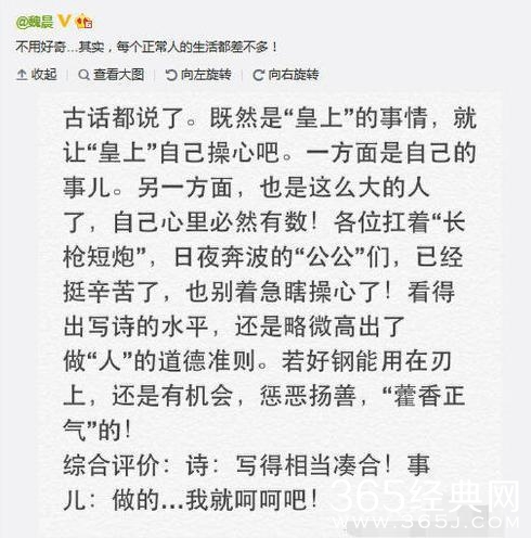 去年4月15日,魏晨与大学同窗于玮爱情被曝光后,魏晨在微博暗讽全民星探是“公公”,“既然是皇帝的事情,就让皇帝操心吧。日夜奔走的公公们,曾经辛劳了,就别焦急瞎操心了”。不过随后卓伟则反唇相讽道:别沉浸在”皇上“的妄想中了,记得本人拉上窗帘就行了!